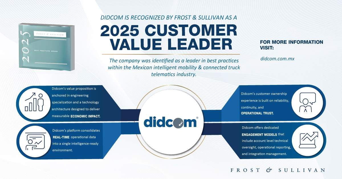 Didcom recibe el Reconocimiento Frost & Sullivan a las Mejores Prácticas en México 2025, al Liderazgo en Valor para el Cliente en Movilidad Inteligente y Telemática para Camiones Conectados impulsando la Innovación centrada en la Flota